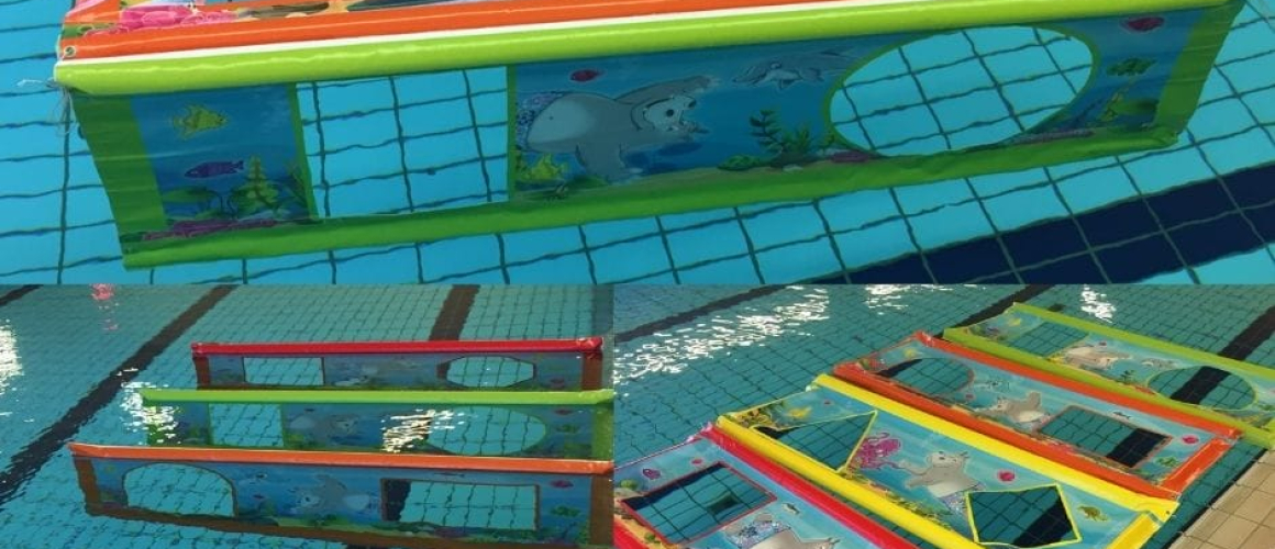 Maar dat hoeft ook niet meer, want inmiddels is het product er in het echt! Wessel en Latisha gingen andere dingen doen, maar Stefan Vedder van Sportfondsen Nederland is verdergegaan met het idee. Samen met Leo, Baukelien en Christa van Zwembad de Waterwyck is het zeil doorontwikkeld en nu zijn er prachtige doorzwemschermen beschikbaar. Op de foto met de afbeeldingen van Jip. Maar ook mogelijk in ‘blanco’ of met je eigen bedrukking er op. Een gat hoeft geen gat meer te zijn! Zelfstandig oefenen en door het gat gaan is vanaf nu écht heel effectief en uitdagend.